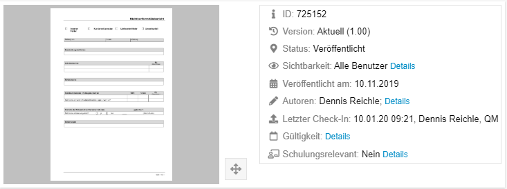 Die Ansicht der Dokumentendetails entspricht der Ansicht bei den Prozessen. Links oder oberhalb von dem Stammdaten wird die an das Dokumente angehängte Datei als Vorschau angezeigt, sofern es sich um eine Word-, PDF- oder Bilddatei handelt.