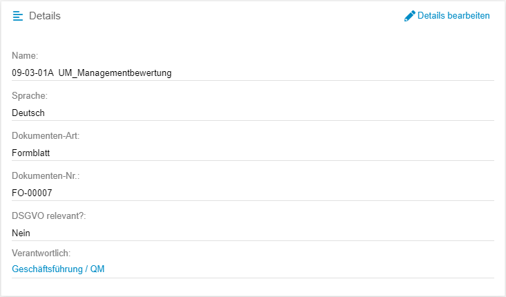 In der Liste Details werden alle Informationen angezeigt, die bei der Erstellung des Dokuments erfasst wurden.