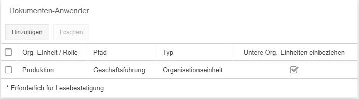 In der Liste Dokumenten-Anwender können über <Hinzufügen> beliebig viele Org.-Einheiten und Rollen aus dem Organigramm eingetragen werden. Über diese Zuordnung ermittelt das System, welchen Benutzern das Dokument in der Liste "Meine Dokumente" angezeigt wird und welche Benutzer bei der Veröffentlichung einer neuen Version des Dokuments per E-Mail benachrichtigt werden.