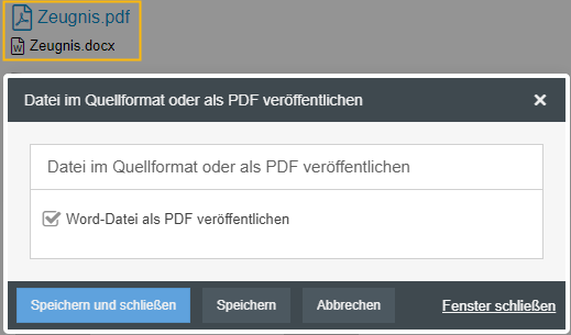 Ob eine Word-Anlage für den Viewer im original Word-Format zur Verfügung gestellt wird oder als schreibgeschützte PDF-Datei, können Sie anschließend für jedes Dokument einzeln über <Dokument im Quellformat oder als PDF veröffentlichen> bestimmen.