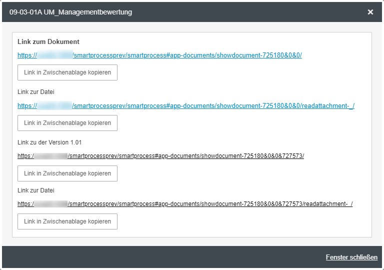 - Link zum Dokument -> Hierbei handelt es sich um einen dynamischen Link. Er führt den Benutzer immer zu der aktuellsten Version des Dokuments, die der Benutzer gemäß seiner Berechtigungen sehen darf.