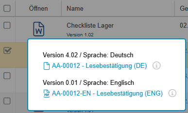 - Link zur Datei -> Öffnet analog zum vorherigen Eintrag die Dateianlage des Dokuments in der angezeigten Versionsnummer.