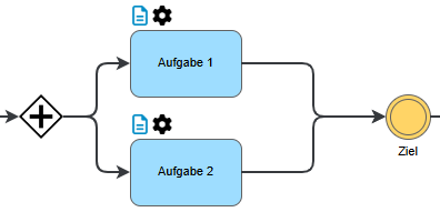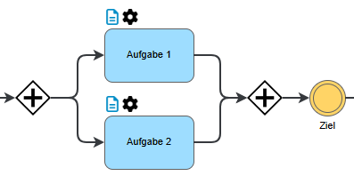 Wenn die parallel durchzuführenden Aktivitäten von der derzeit zuständigen Person bearbeitet werden sollen, können Aufgaben, Sub-Prozesse oder E-Mail senden Objekte hinter dem Gateway modelliert werden. Alle Aktivitäten werden der aktuell zuständigen Person im Vorgang gleichzeitig angezeigt und sie können in beliebiger Reihenfolge abgearbeitet werden (Hinweis im folgenden Abschnitt beachten).