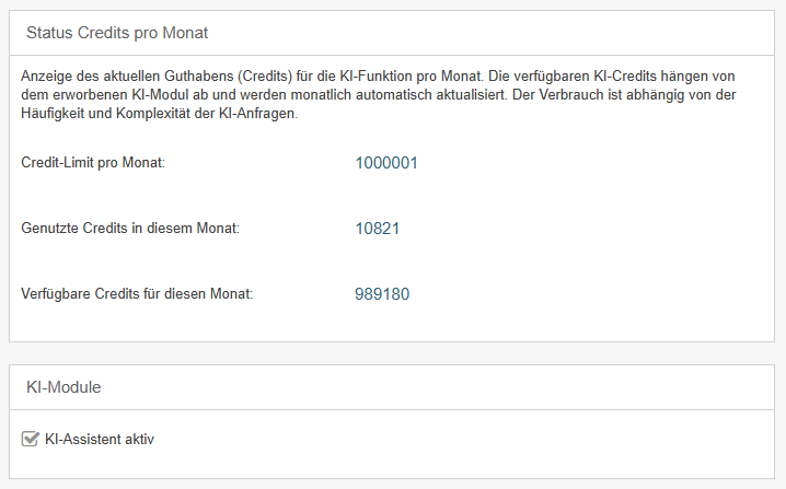 In diesem Menü wird eine Übersicht der Credits für die KI-Funktion SmartAI pro Monat angezeigt. Credits sind das Guthaben für die Verwendung der KI-Funktion. Der Verbrauch ist abhängig von der Häufigkeit und Komplexität der SmartAI-Anfragen. Die Credits werden zu Beginn jedes Monats automatisch auf das ursprüngliche Paketvolumen zurückgesetzt.