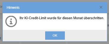 Verfügbare Credits für diesen Monat | Zeigt Ihnen an, wie viele Credits Ihnen in diesem Monat noch zur Verfügung stehen. Die Anzeige wird am Anfang eines jeden Monats zurückgesetzt. Sollten die Credits für den aktuellen Monat aufgebraucht sein, wird Ihnen vom System eine Meldung angezeigt. ![]() In diesem Fall können Sie entweder auf den Beginn des nächsten Monats warten, oder Sie erwerben zusätzliche Credits. |