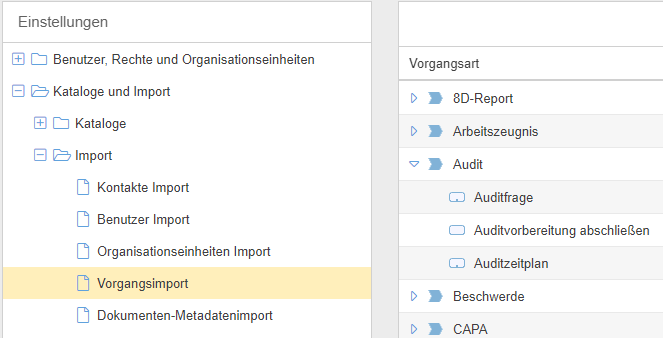 Zur Veränderung der Daten des Audits Nr. 12345 muss in der Importdatei also die Spalte Vorgangsnummer existieren und in einer Zeile den Wert 12345 enthalten.