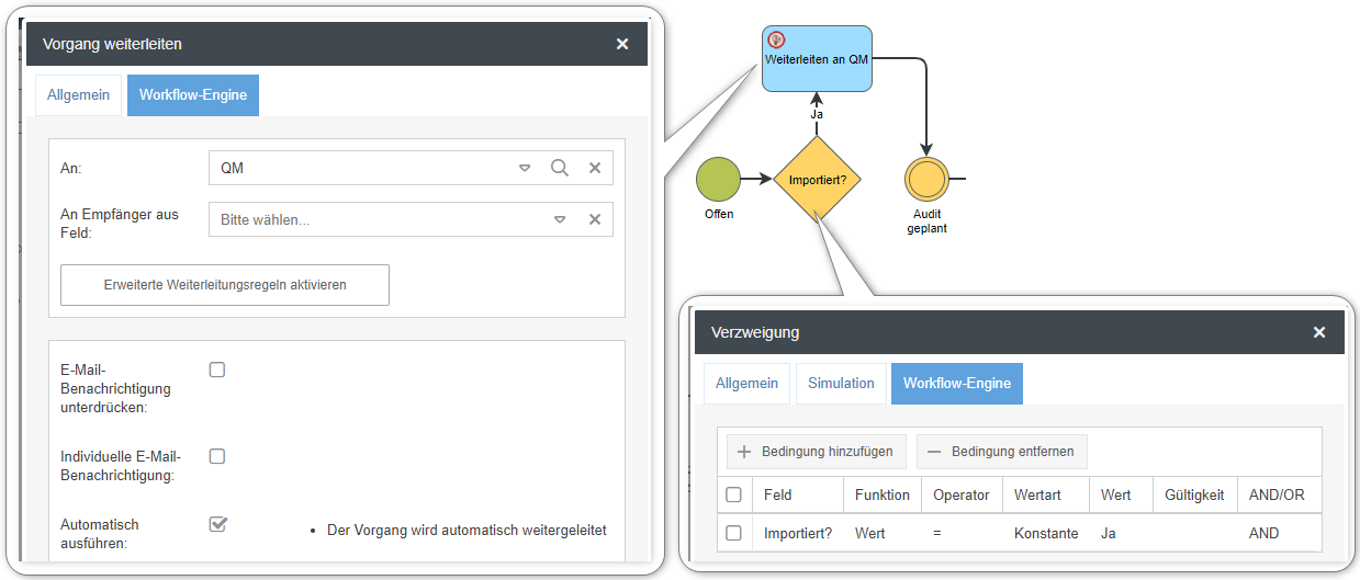 Dabei wird empfohlen diese Informationen nicht in der Importdatei als Spalte aufzuführen, sondern das Prozessmodell des Workflows vor dem Import so anzupassen, dass der Vorgang einerseits automatisch an die gewünschte Organisationseinheit weitergeleitet und anschließend in den gewünschten Status übergeben wird.