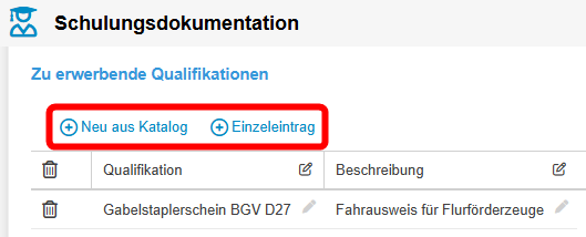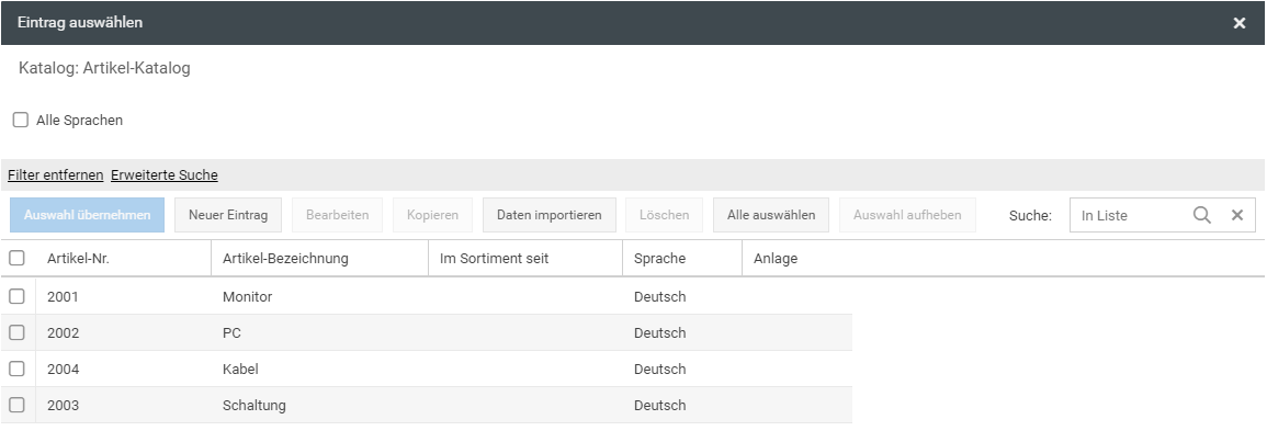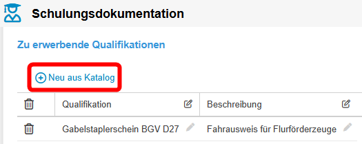 - Erstellung eines oder mehrerer Einträge auf Basis der Katalogdaten über den Button + Neu aus Katalog