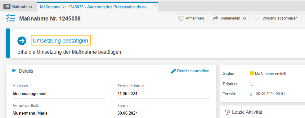 Eine Aufgabe wird in einem Vorgang später als Arbeitsschritt über den Details des Vorgangs angezeigt. Das Formular wird mit einem Klick auf den Link geöffnet.