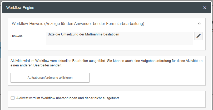 Workflow wird nach Anforderung der Aktivität nicht direkt fortgesetzt. Auf die Erstellung der Aktivität wird gewartet. | Wenn aktiviert, bleibt der Vorgang an dieser Stelle solange stehen, bis die Aufgabe vom Empfänger erledigt wurde. Wenn deaktiviert, wird direkt der nächste Schritt ausgelöst. Wenn nicht an dieser Stelle gewartet werden soll, aber an einem späteren Punkt, kann dort eine Verzweigung genutzt werden, um den Fortschritt zu prüfen. |