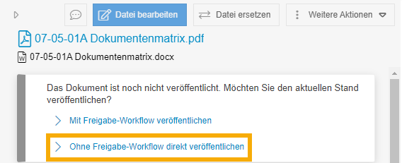 Direkte Veröffentlichung von Dokumenten ohne den Freigabe-Workflow | Wenn diese Option aktiviert ist, dürfen die Benutzer Dokumente veröffentlichen, ohne dass dies im Rahmen des Freigabe-Workflows von weiteren Personen als Prüfende oder Freigebende bestätigt werden muss. ![]() Wenn die Option deaktiviert ist, dürfen die Benutzer Dokumente ausschließlich mit dem Freigabe-Workflow veröffentlichen. |