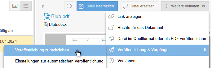 Dokumente zurückziehen und zurückgezogene Dokumente löschen | Wenn diese Option aktiviert ist, dürfen die Benutzer veröffentlichte Dokumente zurückziehen, sprich eine Veröffentlichung rückgängig machen: ![]() Ebenso ist damit das Löschen von zurückgezogenen Dokumenten gestattet. |