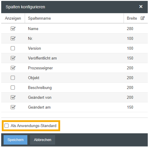 Spalteneinstellungen in Tabellen für andere Benutzer als Standard setzen | Wenn diese Option aktiviert ist ![]() Durch diese Aktion wird die bisherige Spaltenanordnung in der betroffenen Liste bei allen anderen Benutzern überschrieben. |