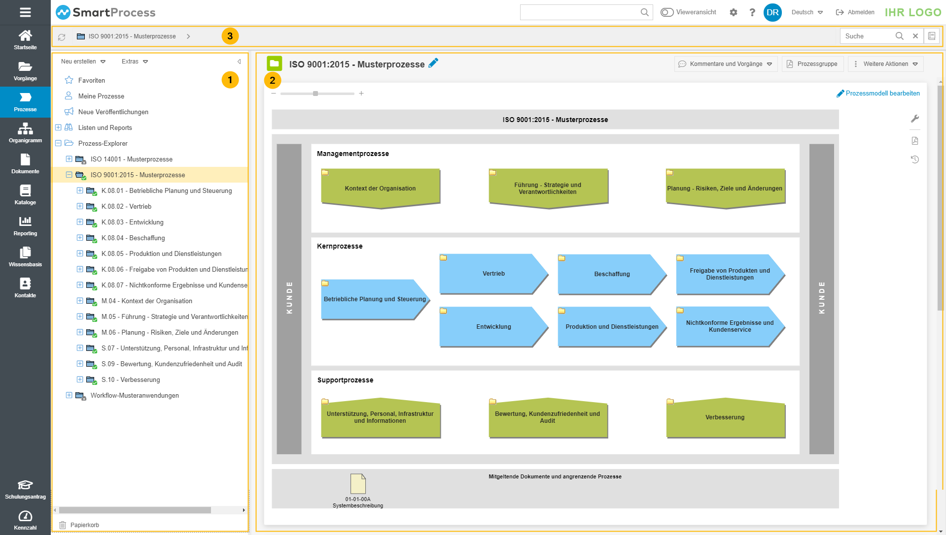 | Hier wird Ihnen der Inhalt angezeigt, den Sie im Navigationsbereich ausgewählt haben. Klicken Sie z. B. im Navigationsbereich auf die Prozessgruppe "ISO 9001:2015 - Musterprozesse" öffnet sich das Prozessmodell dieser Gruppe im Inhaltsbereich. |