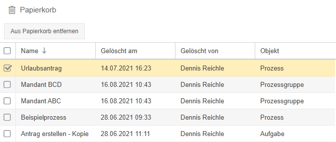 Wenn Sie Prozessgruppen, Prozesse oder Aufgaben an jeder wiederverwendeten Stelle löschen, werden diese in den Papierkorb verschoben. Dort wird Ihnen angezeigt, welcher Benutzer das Objekt zu welchem Zeitpunkt gelöscht hat. Im Papierkorb haben Sie folgende Möglichkeiten: