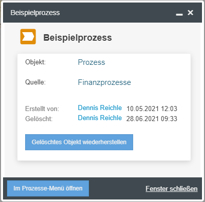Objekt aus dem Papierkorb wiederherstellen | Klicken Sie auf eine Prozessgruppe, einen Prozess oder eine Aufgabe im Papierkorb. Über <Gelöschtes Objekt wiederherstellen> wird der Prozess zurück in den Prozess-Explorer an die Position verschoben, wo sich der Prozess vor dem Löschen zuletzt befand (im Screenshot "Quelle = Finanzprozesse") ![]() |