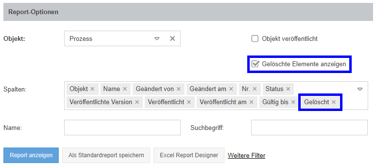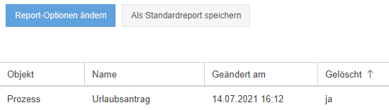 Objekt aus dem Papierkorb entfernen | Markieren Sie ein oder mehrere Objekte per Checkbox und klicken <Aus Papierkorb entfernen>. SmartProcess fragt noch einmal, ob Sie die Objekte wirklich entfernen möchten. Nach erneuter Bestätigung, sind die Objekte aus dem Papierkorb entfernt. ![]() Wenn Sie Objekte auch aus dem Papierkorb entfernt haben, können Sie diese im Menü Prozesse nicht mehr finden. Die Objekte sind allerdings nicht endgültig gelöscht. Beim Reporting von Prozessgruppen und Prozessen kann die Checkbox <Gelöschte Elemente anzeigen> aktiviert werden und als Spalte die Information "Gelöscht" eingeblendet werden. ![]() Wird dieser Report ausgeführt, werden in der Liste auch die gelöschten Prozesse angezeigt, die aus dem Papierkorb entfernt wurden. Mit einem Klick auf den betroffenen Prozess kann dieser aus dem Reporting wiederhergestellt werden. ![]() |