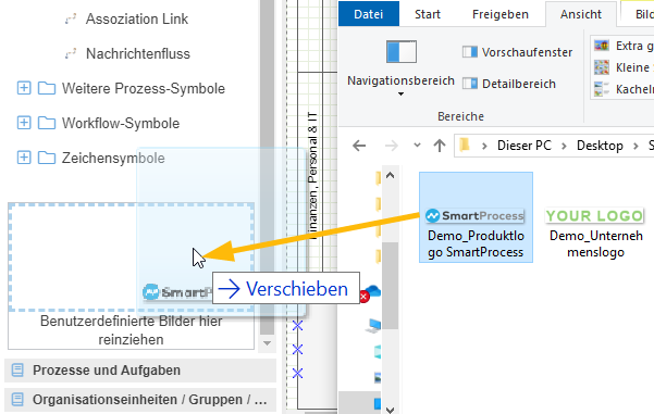 Hierfür steht am unteren Ende vom Symbolbereich im Prozessdesigner ein Bereich zur Verfügung, in dem beliebig viele Bilddateien per Drag & Drop hinzugefügt werden können.