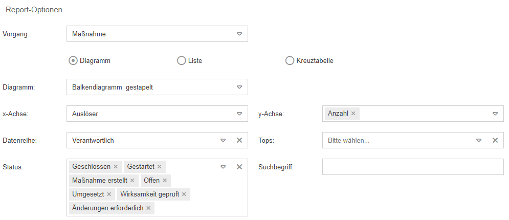 Folgend wird die Konfiguration eines Diagramms anhand des Beispiels gezeigt, dass alle offenen und abgeschlossenen Maßnahmen gruppiert nach ihrem Auslöser in einem Balkendiagramm angezeigt werden sollen.