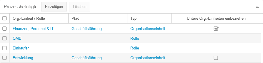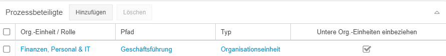 Wenn weitere Organisationseinheiten / Rollen als Prozessbeteiligte eingetragen werden sollen, kann dies manuell über den Button <Hinzufügen> in der Liste 'Prozessbeteiligte' erfolgen.