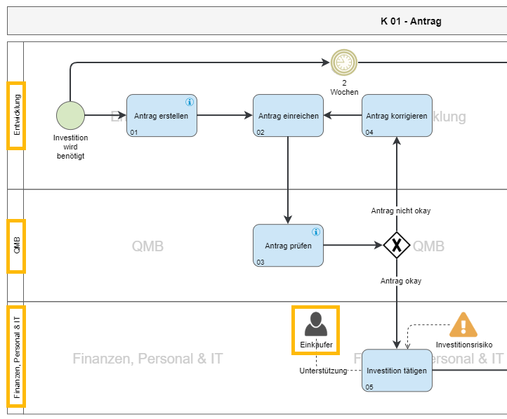 Wenn eine Org.-Einheit / Rolle zu einer Swimlane oder als zusätzlicher Teilnehmer im Prozessmodell verknüpft wurde, werden diese Objekte automatisch in die Liste 'Prozessbeteiligte' eingetragen.