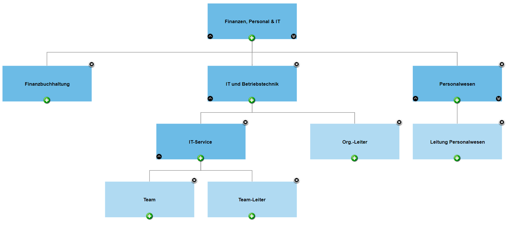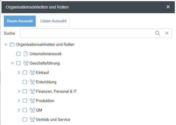 In dem Fall öffnet sich das Organigramm, aus dem beliebig viele weitere Organisationseinheiten / Rollen ausgewählt werden können.
