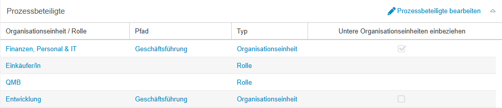 In dem Fenster 'Prozessbeteiligte' werden alle Organisationseinheiten und Rollen aufgelistet, die an der Durchführung eines Prozesses mitwirken.