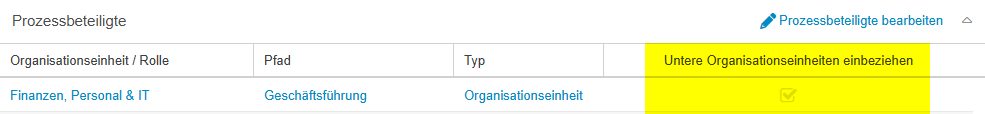 In dem Beispiel hätte das Aktivieren der Checkbox zur Folge, dass jeder Benutzer, der einer der Organisationseinheiten aus dem unteren Screenshot zugeordnet ist, als Prozessbeteiligter gilt. Ist die Checkbox nicht aktiviert, gelten die beschriebenen Auswirkungen nur für Benutzer, die explizit der Organisationseinheit 'Finanzen, Personal & IT' zugeordnet wurden.