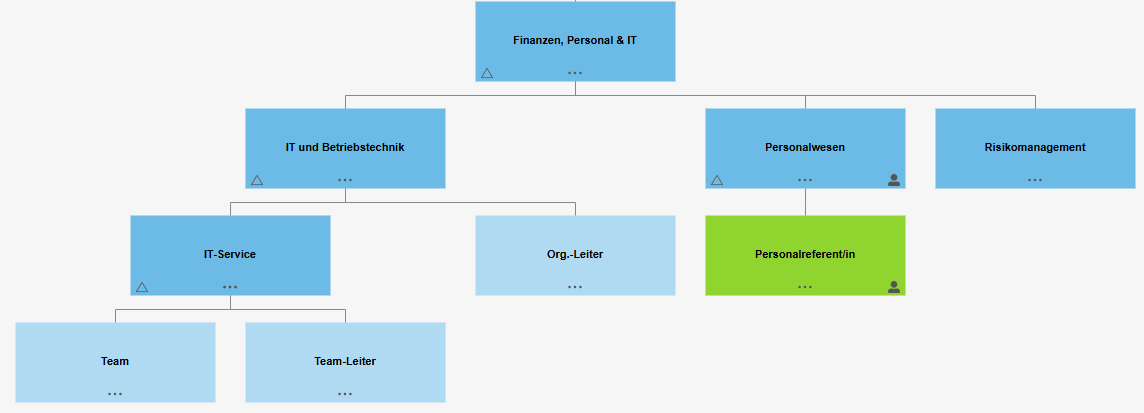 Mittels der Checkbox <Untere Organisationseinheiten einbeziehen> in der Liste 'Prozessbeteiligte', können die beschriebenen Auswirkungen auch an alle Organisationseinheiten weitergegeben werden, die im Organigramm unterhalb dieser Organisationseinheit aufgelistet sind (im Beispiel: Finanzen, Personal & IT).