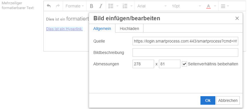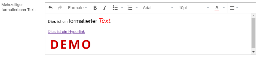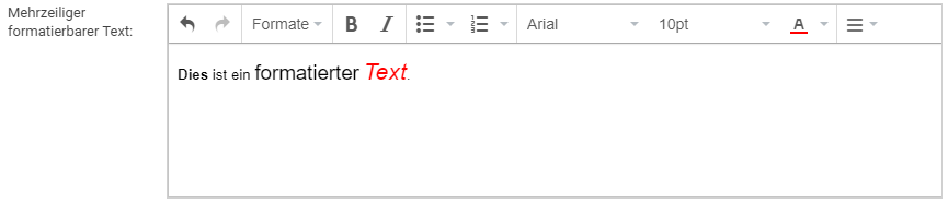 Mit einem Feld vom Typ "Mehrzeiliger formatierbarer Text" kann ein Feld in einem Vorgang angezeigt werden, in dem ein mehrzeiliger formatierbarer Text eingetragen werden kann. Dieses Feld verwendet einen WYSIWYG-Editor.