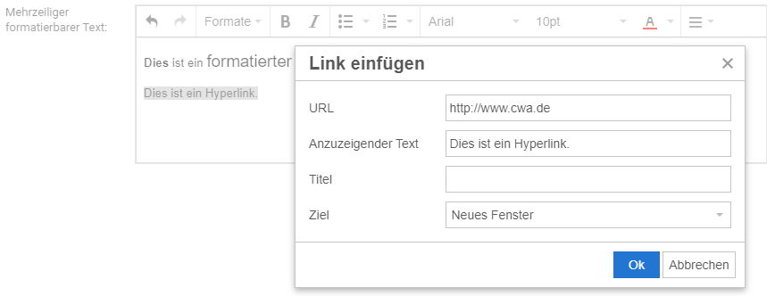 So können z.B. Hyperlinks zu externen sowie internen Quellen eingefügt werden. Hierzu muss zunächst ein Teil des Textes markiert werden, der zu einem Hyperlink gemacht werden soll. Über die Funktion "Link einfügen/bearbeiten" kann dann ein neuer Link eingegeben werden. Im Feld "Ziel" kann eingestellt werden, ob der Link sich im selben Fenster oder einem neuen Fenster öffnen soll.