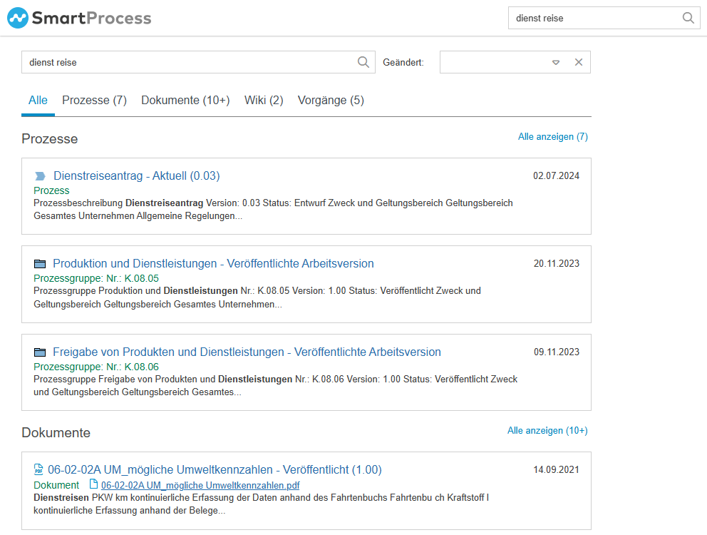 Wenn die Suche also nicht von der Startseite, sondern aus dem Menü Prozesse gestartet wird, ist zunächst automatisch der Reiter mit den Ergebnissen für Prozesse im Fokus.
