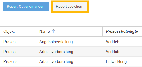 Nach dem Klick auf den Button öffnet sich ein Fenster. Unabhängig davon, ob ein Report für Prozesse / Dokumente oder für Vorgänge gespeichert wird, sind die Optionen identisch.