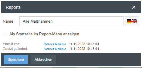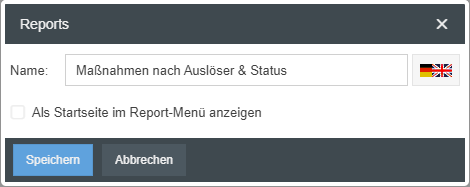 Name | Der Name des gespeicherten Reports kann in allen aktivierten Systemsprachen eingetragen werden. Unter diesem Namen wird der Report anschließend in der Liste aller gespeicherten Reports erscheinen. |