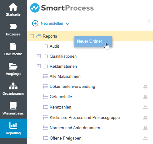 Mit einem Rechtsklick auf den obersten Ordner <Reports> können Ordner und Unterordner erstellt werden. In diese Ordner können die einzelnen gespeicherten Reports für eine bessere Übersichtlichkeit per Drag & Drop verschoben werden.
