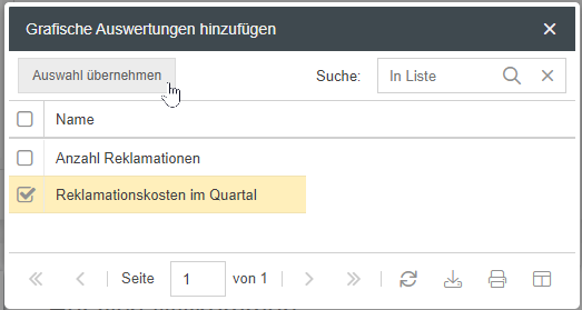 Über den Button <+ Hinzufügen> bekommen Sie weitere gespeicherte Diagrammreports angezeigt, die Sie für sich persönlich in dem Fenster Grafische Reports anzeigen lassen können. Wählen Sie die gewünschten Reports zur Anzeige aus und bestätigen die Auswahl mit <Auswahl übernehmen>.
