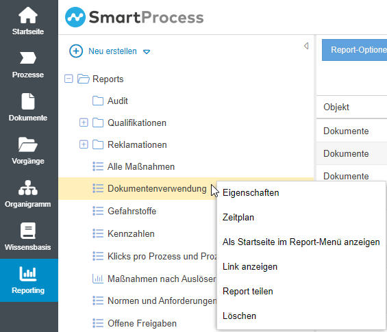 Dies funktioniert sowohl bei Reports für Prozesse und Dokumente als auch bei Reports für Vorgänge in sämtlichen Varianten (Liste, Diagramm, Kreuztabelle).