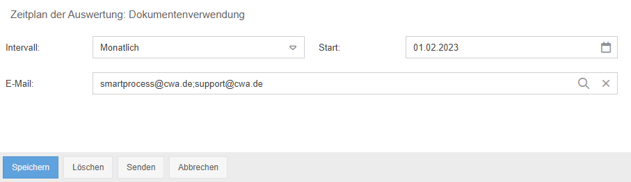 Das Startdatum legt den ersten Tag des Versands der E-Mail fest. Von diesem Tag an wird der Report regelmäßig in dem ausgewählten Intervall versendet. Als Empfänger können über die Lupe im Feld E-Mail ein oder mehrere SmartProcess-Benutzer ausgewählt werden, deren E-Mail Adressen übernommen werden. Darüber hinaus können auch händisch per Semikolon getrennt weitere Empfängeradressen in dem Feld E-Mail erfasst werden.