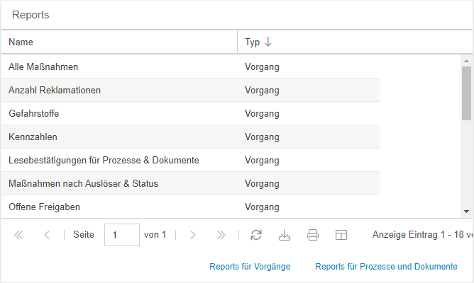 Im Navigationsbereich des Reporting-Menüs werden dem Benutzer alle verfügbaren Reports alphabetisch sortiert angezeigt. Per Linksklick können diese ausgeführt werden.