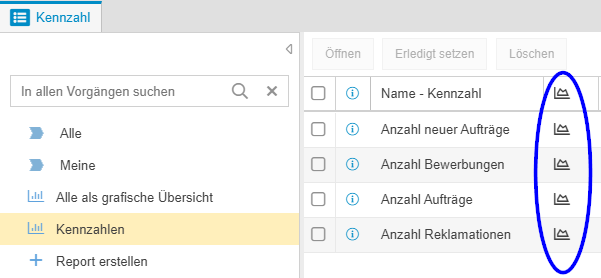 - Im Standardreport Kennzahlen ist es nun möglich über das Diagramm-Symbol in der entsprechenden Spalte eine Chart-Darstellung der ausgewählten Kennzahl anzuzeigen.