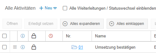 - Im Vorgangsfenster können die Einträge in der Aktivitätenliste mit einem Klick eingeklappt oder expandiert werden.