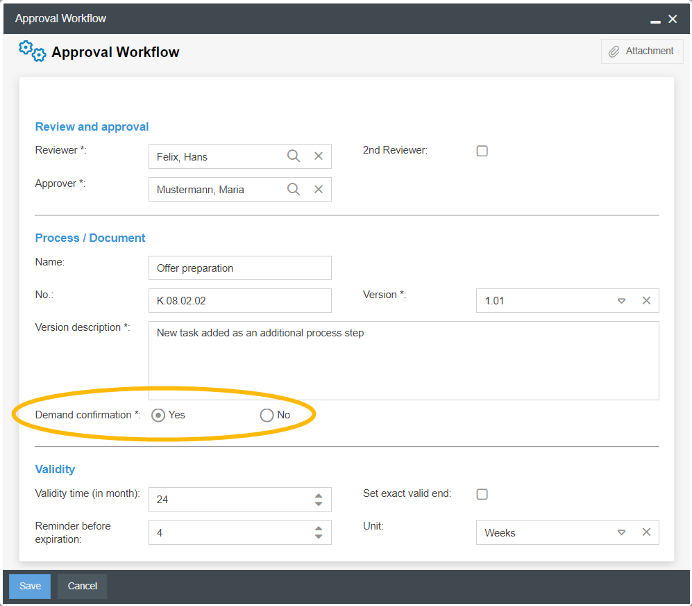 If Yes is selected, a new case of the Read confirmation workflow is generated for editing after successful publication of the process or document for each process participant resp. document user and the owner resp. the responsible. The affected users are informed about this new case via e-mail.