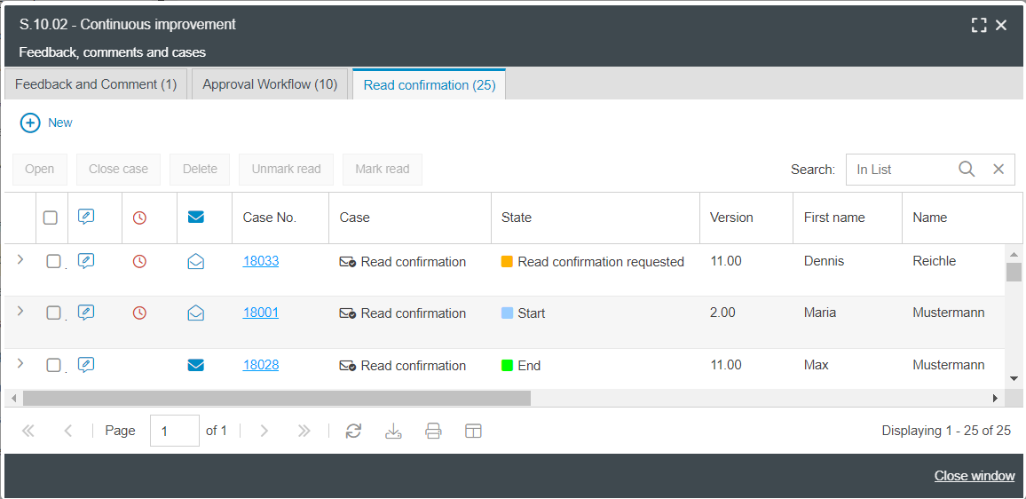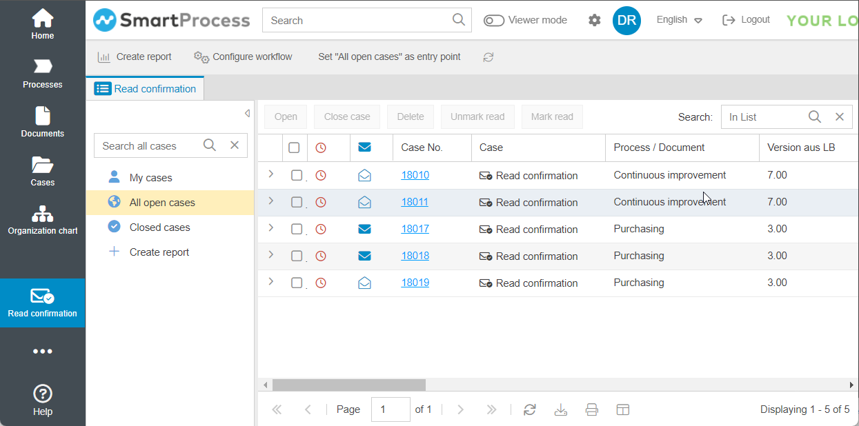 - In the SmartProcess menu Cases in the My cases list, all open cases, including requested read confirmations, are listed.