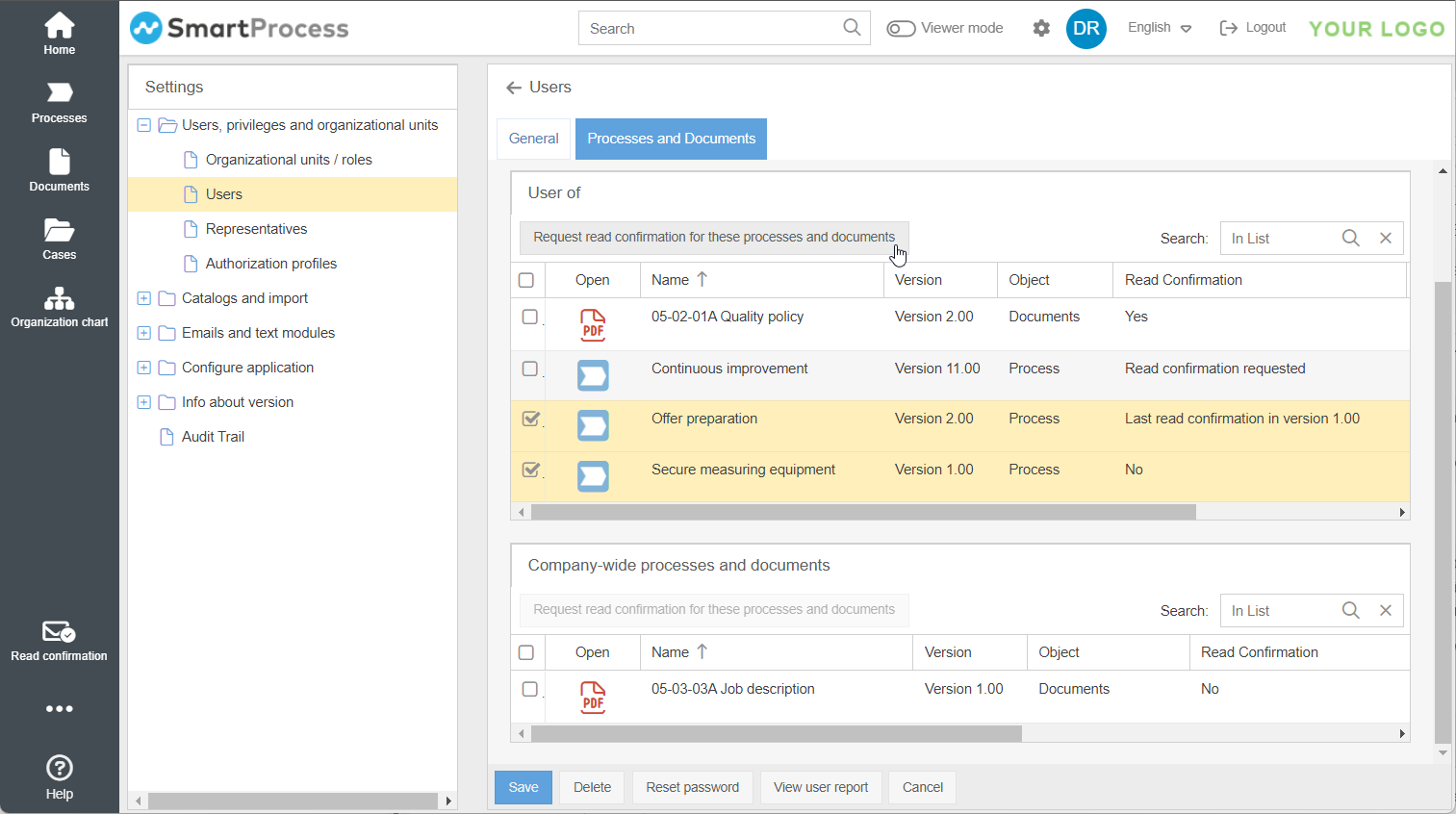 If any missing read confirmations are detected for the user, they can be marked in the list and requested using the Request read confirmation for these processes and documents button.