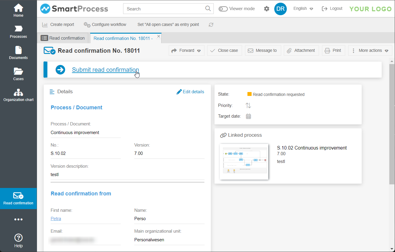 If the user has opened the case window, he can open the affected process or document for viewing and confirm his task via the Submit read confirmation link.
