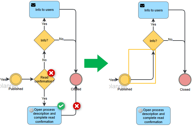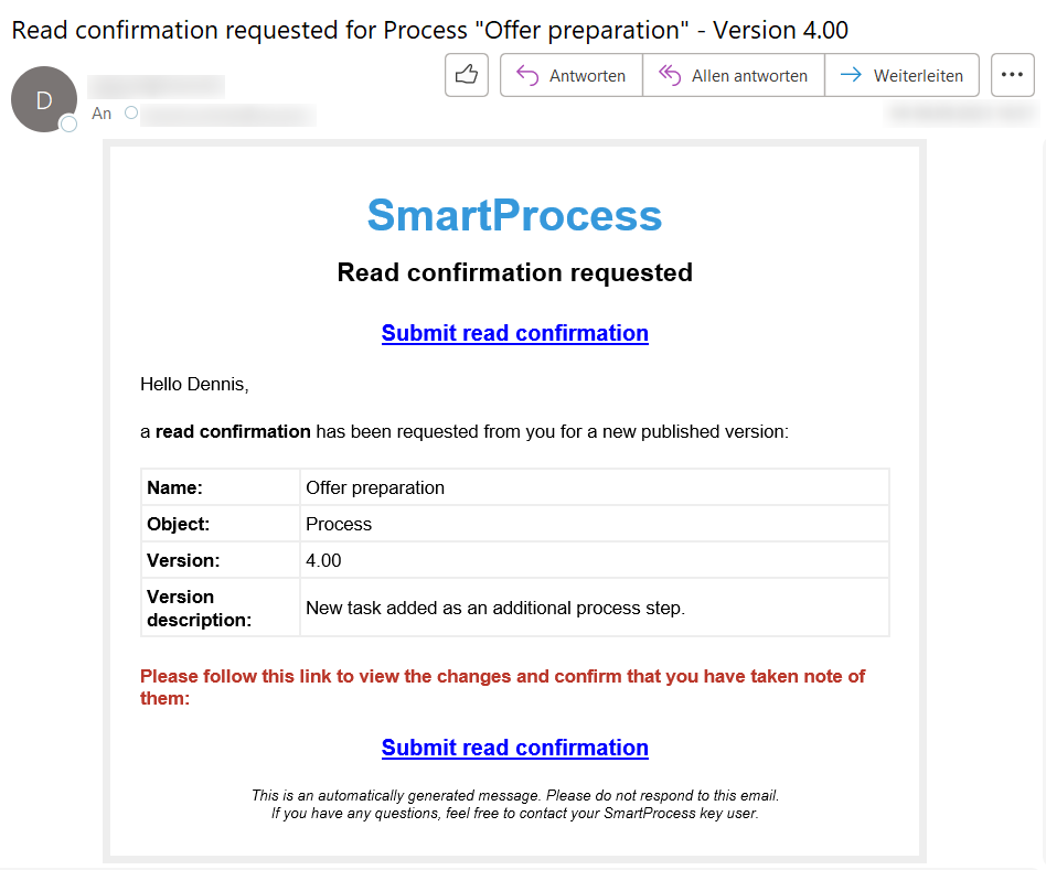 The read confirmation is a workflow whose purpose is on the one hand to inform users about newly published versions of processes and documents and on the other hand to request an active confirmation from these users that they have taken note of the changes of the process / document.
