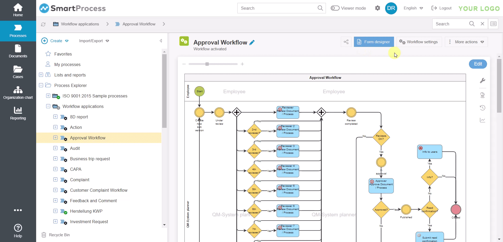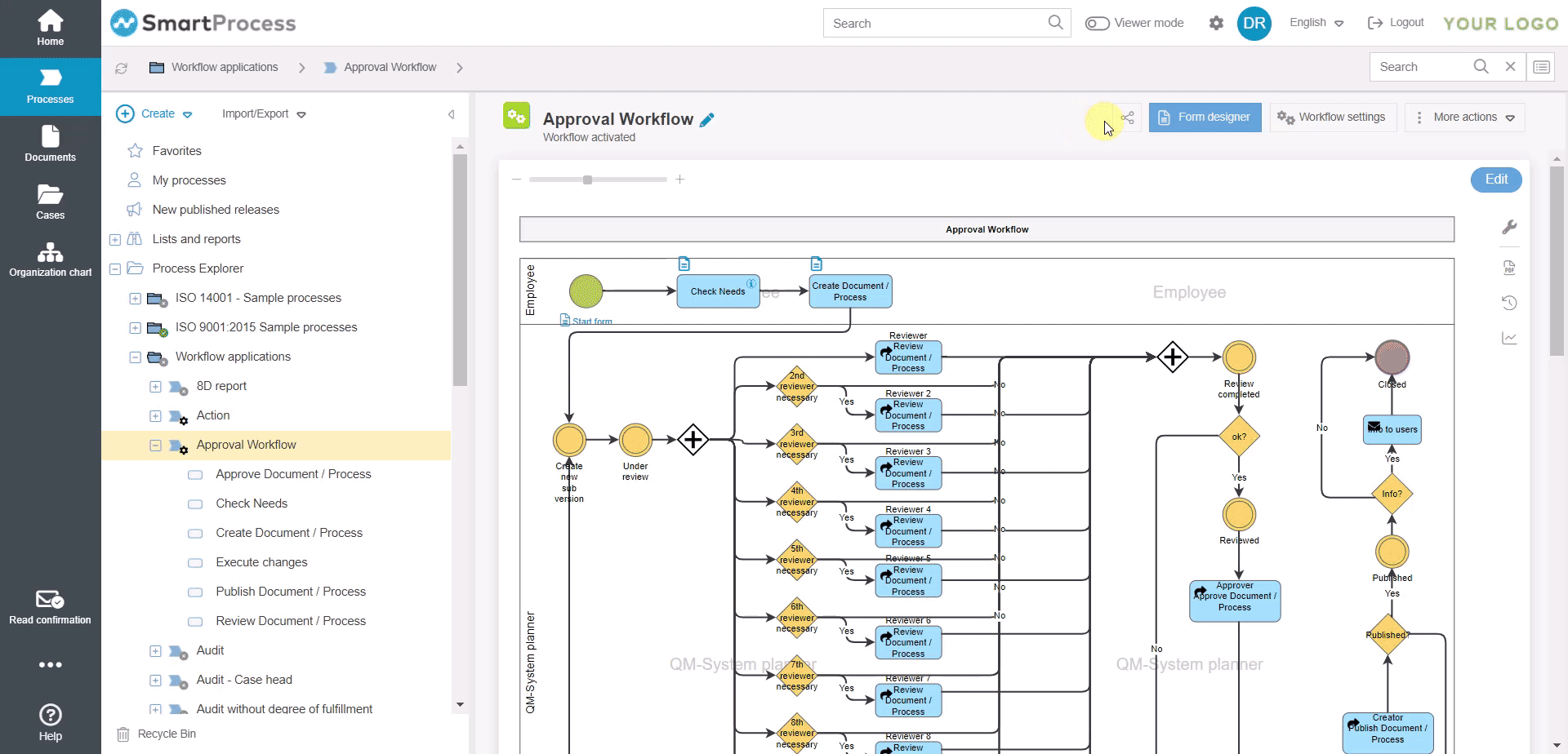 - In the Processes menu, open the approval workflow and there the form designer. In the form designer, edit the Demand confirmation field as follows: