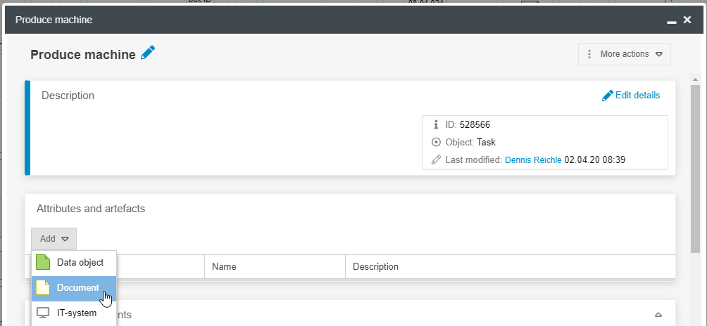 With the artifact, the document is placed in the process model so that it is visible to the user, who can open it and download it for editing.