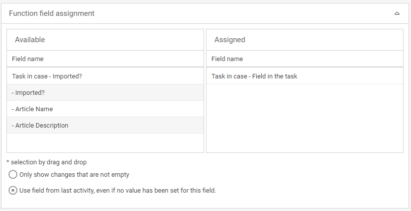 Use field from last activity, even if no value has been set for this field | Always displays the value of the field from the task, even if this field was not filled in the task. |