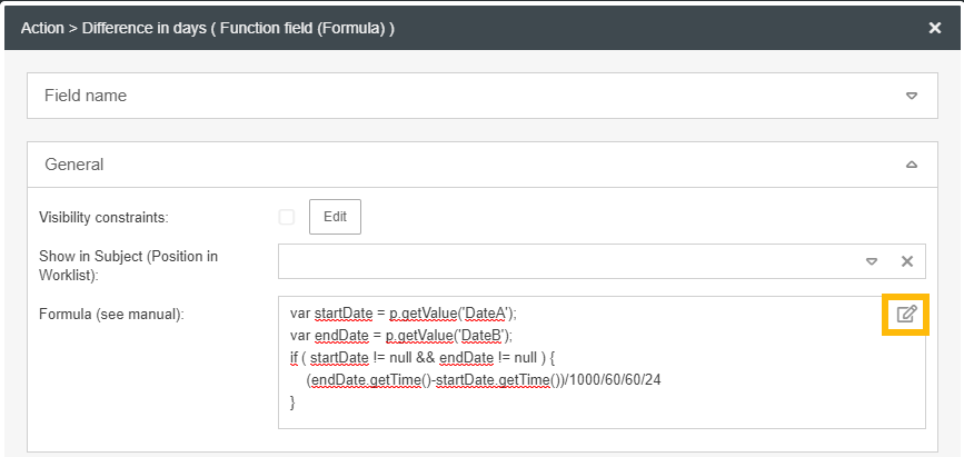 Statements are entered as formulas in JavaScript. These statements are evaluated and the result of the formula is then displayed in the formula field in the main form.